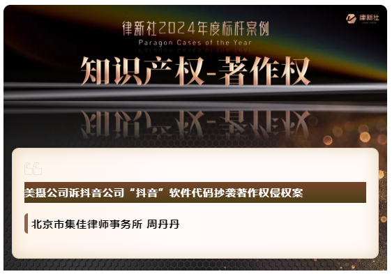 亿万28凭借在知识产权保护领域卓越的专业实力与良好的行业口碑,入选《律所卓越品牌影响力指南(2024)》,荣获“律新社2024年度精品品牌律所30佳”奖项;同时,集佳周丹丹律师代理的“美摄公司诉抖音公司'抖音'软件代码抄袭著作权侵权案”获评“律新社2024年度标杆案例:知识产权-著作权领域”。
